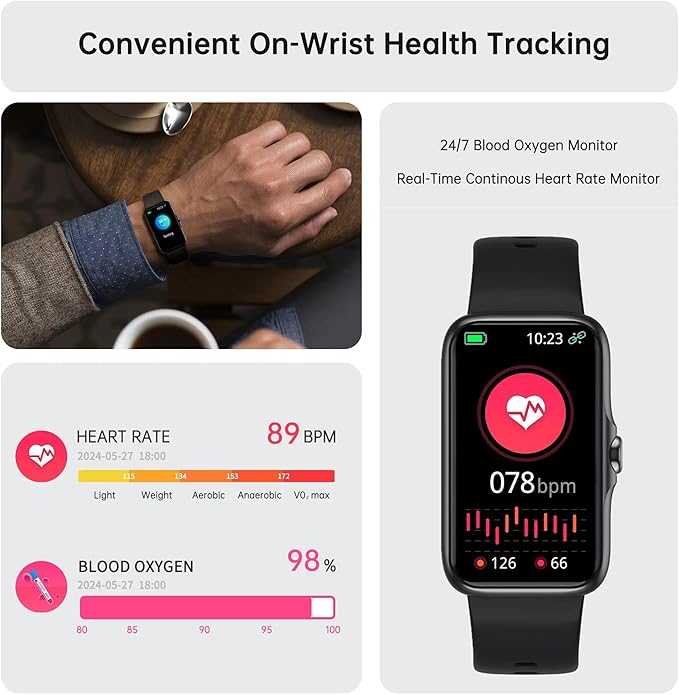 • Health Fitness Tracker, Smart Watch with 24/7 Heart Rate and Blood Oxygen, Sleep Tracker, IP68 Waterproof Activity Tracker Pedometer Step Counter for Women Men. (Black)