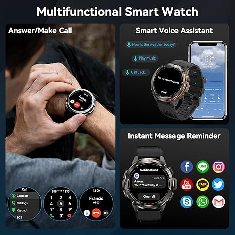 • ANSWER/MAKE CALLS & AI VOICE ASSISTAN - A very handy tool built in the Bluetooth watch. Use your voice to give instructions and the voice assistant will do the rest. You can ask questions, play your desired music, and check weather, set alarms and timers. You can also make voice calls through the voice assistant, makes the scenes that are inconvenient to hold a mobile phone (For example: driving) in daily exercise and life more concise and smart.