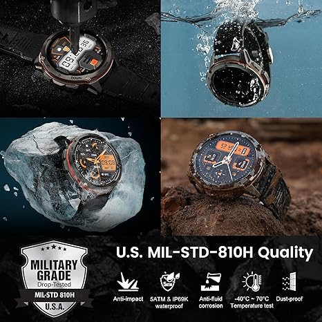 • MILITARY GRADE STANDARD(MIL-STD-810H) STAINLESS STEEL BODY - AMAZTIM T3 Ultra smart watch features Corning Gorilla screen, Mohs hardness up to 9H, it's strong enough to deal with a range of screen-destroying behaviors. Military-grade Stainless Steel materials make it indestructible and most durable. Successfully passed 15 military tests of the highest military toughness standard (MIL-STD-810H), including salt spray, rain, impact, etc. It can easily face any harsh environment.